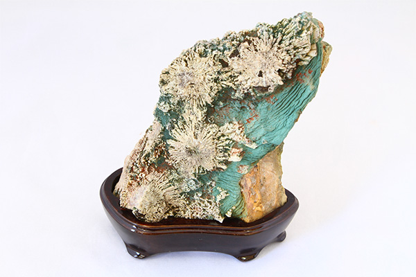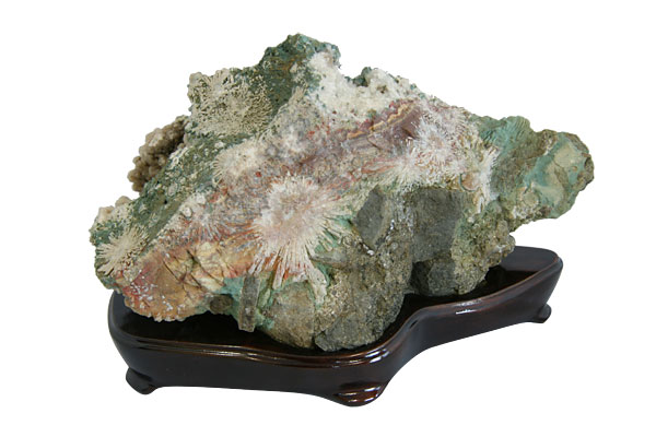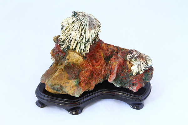 玄武岩の中に放射状の割れ目ができ、この中に方解石や玉髄等が入り、花の模様ができたもの、又は方解石が石英等に置き換わったという説。玄武岩の中にアラゴナイト(霰石)の結晶が放射状に現れ、アラゴナイトがやがて方解石、後に石英となったという説。日本では下仁田・奥多摩・岐阜が知られていますが、特に有名なのが岐阜と下仁田の菊花石。当店では、各種下仁田菊花石を取り揃えております。