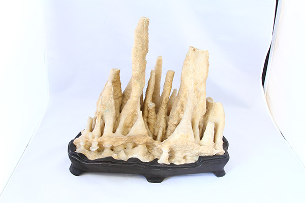 鉱物質を含んだ水溶液が天井面から落下する時に、炭酸カルシウムなどの沈殿物を濃集させ、天井面から下がるつらら状の棒が鍾乳石です。鍾乳石の先端から落ちる水滴が、直下の床面により多くの方解石を集積し、最終的にはドーム型ないし円錐形の突起物を形作ります。これを石のタケノコ、石筍(せきじゅん)といいます。