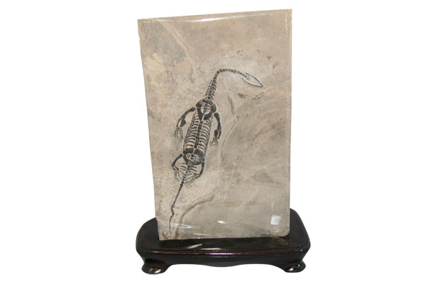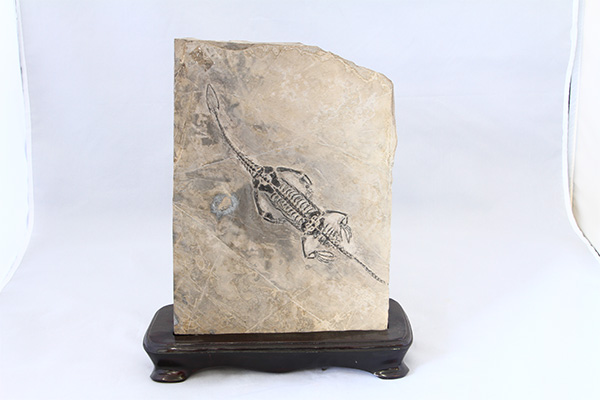 貴州竜は、三畳紀中期(2億4000万年〜2億3000万年前)、体長は30センチメートル前後の小型水棲爬虫類です。竜という名前が付いていますが、恐竜ではなく恐竜が栄える前の海に住んでいた爬虫類です。手足には指がありますが、海での生活に適応してヒレ状になっていたようです。細長い身体を蛇のようにクネクネと曲げて泳いでいたといわれていますが、長い首がどのような役割を果たしてきたのか、小魚などを捕まえるのに便利であったのかどうかはわかっていません。中国産で、現在は輸出禁止ですので、たいへん貴重な化石です。