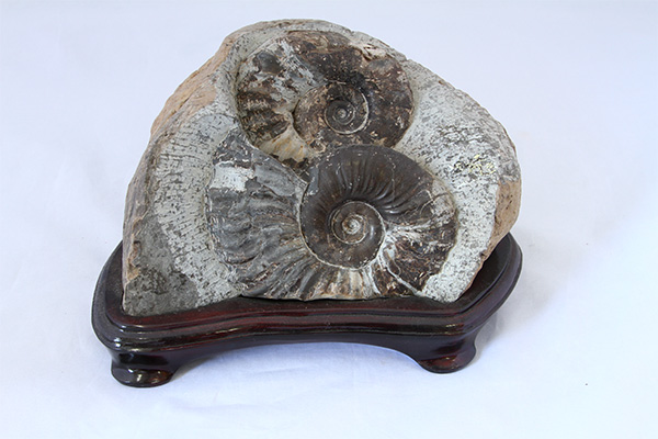 アンモナイトは約4億年前のデボン紀から6500万年前の白亜紀まで栄えた、海にすむイカやタコの仲間(軟体動物頭足類)です。殻の下には独特の模様が見られ、これは殻の中の部屋と部屋とをしきる壁の模様で、縫合線といいます。この縫合線は進化とともに複雑な模様になることが知られていて、アンモナイトの形とともに分類のめやすになっています。